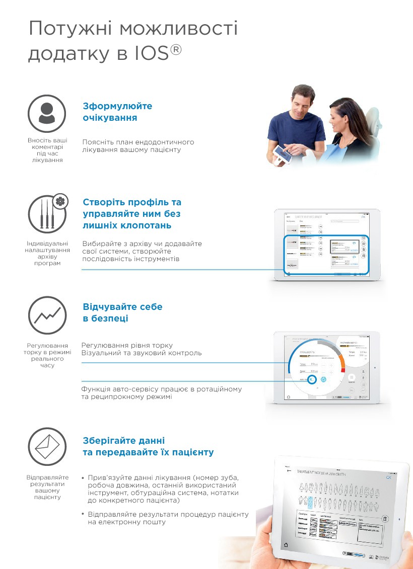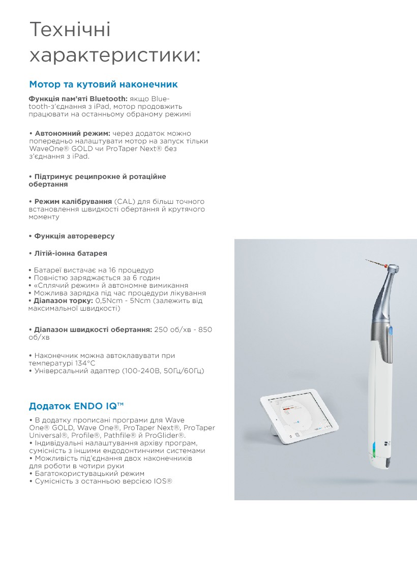 Технологічний бездротової ендодонтичний мотор, який працює через додаток для Apple iPad mini.