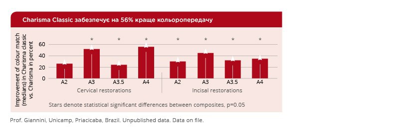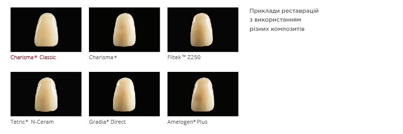 Charisma Classic і технологія Microglass® II ідеально підходять для простих одношарових реставрацій, тоді як Charisma Topaz підходить для більш складних випадків вимагають різноманітності відтінків і прозоростей. Charisma Topaz заснована на нашій інноваційної матриці TCD, яка поєднує в собі високу міцність на вигин і низьку усадку.