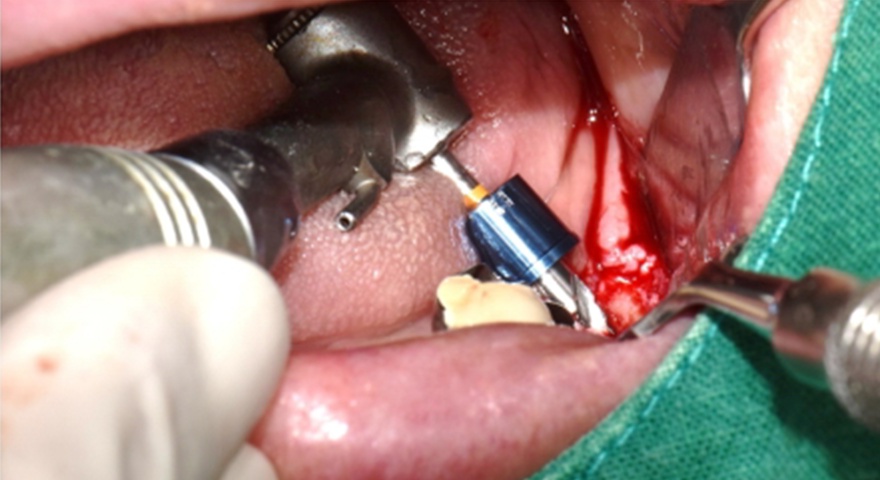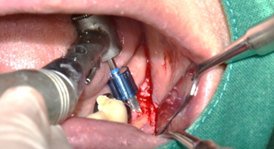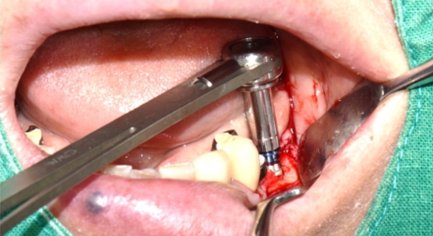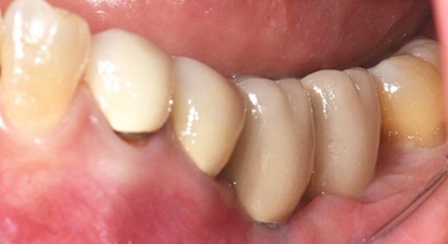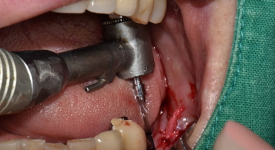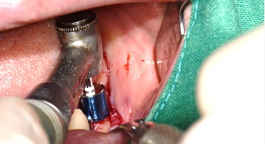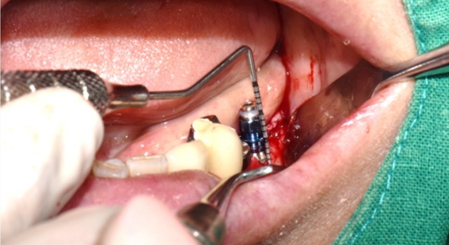 - Імплантат був розміщений на місці зуба #44 з вузькими проміжками і тимчасова реставрація з акрилової смоли була негайно встановлена.